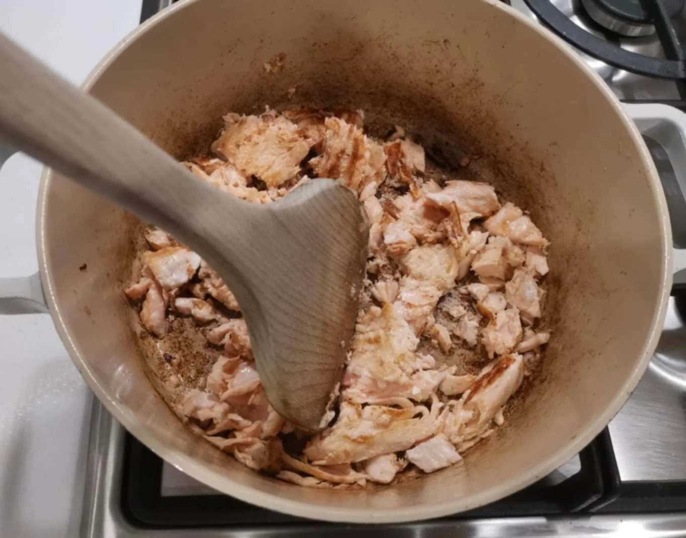 5. Add another 0.5-1 teaspoon of oil and use a medium flame to pan-fry the salmon in the same pot. When both sides of the salmon are cooked, cut them into smaller pieces with your stir stick.